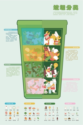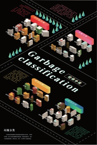 垃圾分类一般是指按一定规定或标准将垃圾分类储存、投放和搬运,从而转变成公共资源的一系列活动的总称。垃圾分类的目的是提高垃圾的资源价值和经济价值,减少垃圾处理量和处理设备的使用,降低处理成本,减少土地资源的消耗,具有社会、经济、生态等多方面的效益。该学生用两种艺术手法进行垃圾分类的信息化设计表达。图5-32为相对传统的插图化表达,对于物品绘制采用扁平化的风格。图5-33采用2.5D的方式绘制物品,风格更现代,画面更加有趣。