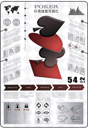 扑克指纸牌,扑克游戏指以用纸牌来玩的游戏。一副扑克牌共有54张牌,其中52张是正牌,另两张是副牌(大王和小王)。图5-34为西方的扑克牌的信息可视化图表设计。分别展示了牌的组成、牌面画面信息、基本玩法、区域分布等信息,图形和色彩的设计符合代表性牌类游戏的视觉符号化特征。