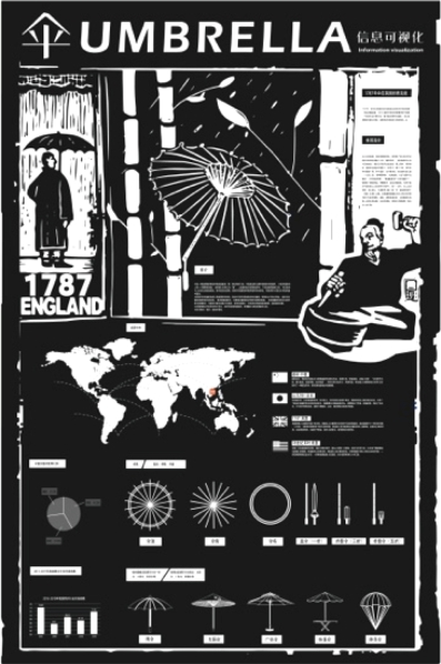 伞是一种能够提供阴凉环境或遮蔽雨、雪、阳光等的生活用品。伞与人们的生活息息相关。中国是世界上最早发明雨伞的国家,伞是中国劳动人民一个重要的创造。受中国文化影响,亚洲许多国家很早就有使用伞的传统,而欧洲至16世纪才开始风靡中国伞。该学生对伞的发明等信息进行调研,在信息设计图表中表现伞的分类、构造折数和在世界各地的传播。图5-37的信息量虽然不是很复杂庞大,但学生用中国黑白木刻古朴的艺术形式加以表现,增加了信息图表的艺术表达特质。