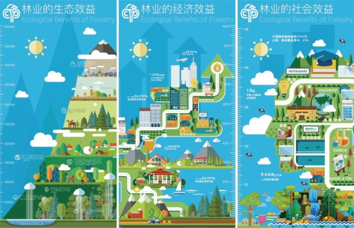 学生该设计的前期调研,主要通过研读政府报告理解相关政策,统计我国林业的发展状况,总结林业三大效益——生态效益、社会效益和经济效益。三大效益是统一的,是相互联系和相互渗透的。调研后学生用扁平化的插图风格绘制林业三大效益的信息图,将自然、人类和城市建设三大主题图融合到森林中,体现了人、社会与林业和谐共处的主题(图5-40)。