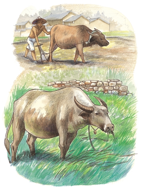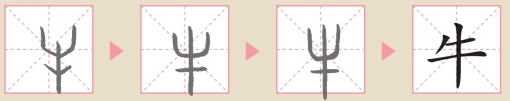 牛是一种特别能吃苦耐劳的动物。在以前的农村,人们常用它来耕田翻地。牛长着两只坚硬的牛角和一条可以甩来甩去的尾巴,背部宽厚且强壮有力。“牛”字是根据牛的样子造的。从“牛”字的上面俯瞰下去,你是不是可以看到它的两只大牛角、牛身和中间突出的脊背呢?