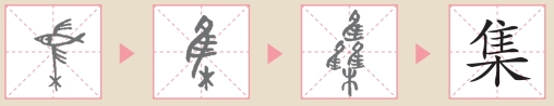 “集”有聚合的意思。古文的“集”字,就是根据群鸟聚集在树上的样子造的。“集” 字的上部本来画了三只鸟,用来表示众鸟的意思;下面是一棵树,意思是很多鸟聚集在一棵树上。后来,三只鸟减成一只鸟,但意思保持不变。