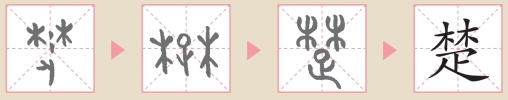 ”,表示血迹。因为人走入荆棘丛生的林中,很容易受伤流血,因此“楚”字也指处罚的工具或表示痛苦的意思(例如痛楚)。