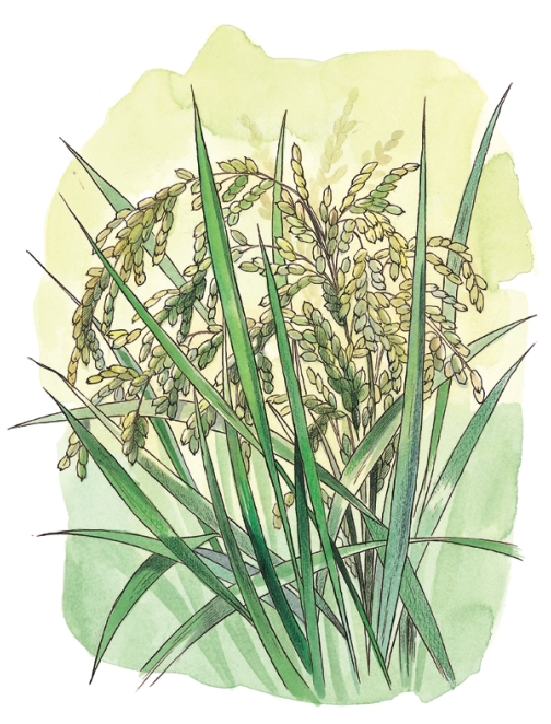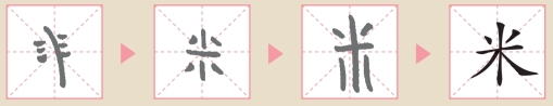 ” 表示稻穗的梗,两旁各三点则表示已经成熟的籽实饱满的稻谷。因为古文中三个重复的符号表示“多”的意思。稻谷脱皮去糠之后,就成了我们日常食用的稻米。
