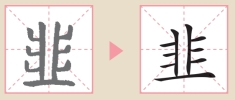 ”表示韭菜中央的茎叶,左右两旁各有三画则表示层层叠叠的扁平而细长的韭菜叶,下面的一横“
