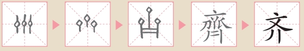 “齐”字的本义是整齐、平齐。古文中,“齐” 字的字形是谷、麦作物的穗长得齐整的样子,用三个同样的符号表示很多齐头平的麦穗。演变到小篆时,因为谷、麦作物是生长在土地上的,土地有高有低,所以麦穗看起来也好像有高有低,于是就把长在较高地方的那部分麦穗画得高一点,就像“齐”字中间的那根麦穗下面有高凸出来的土地,所以看起来比两旁的高一些。