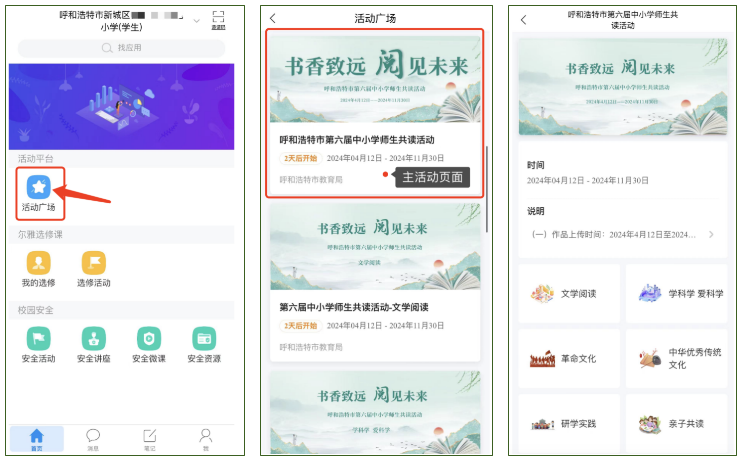 点击“活动广场”——找到“第六届中小学师生共读活动”入口——点击进入