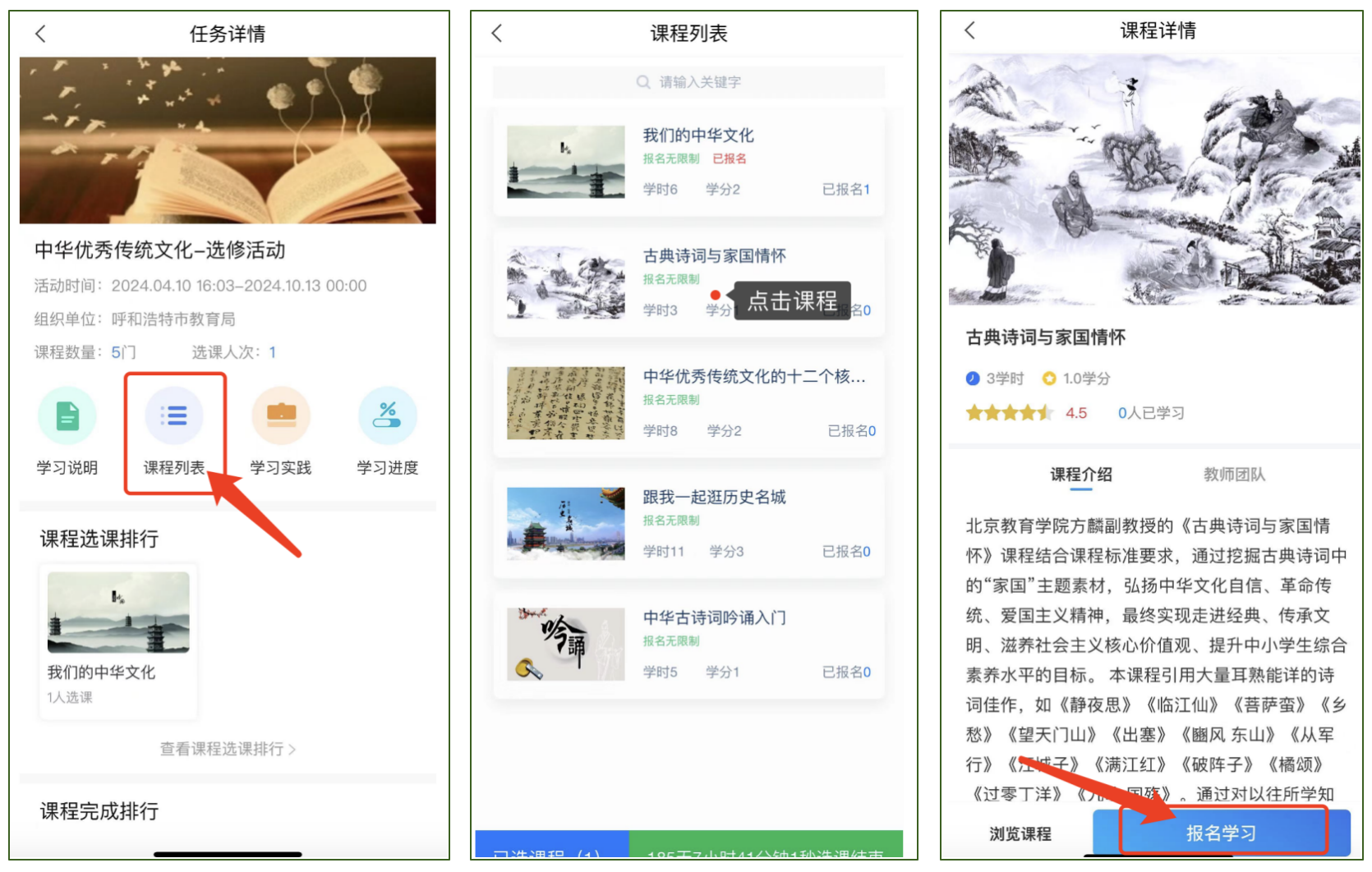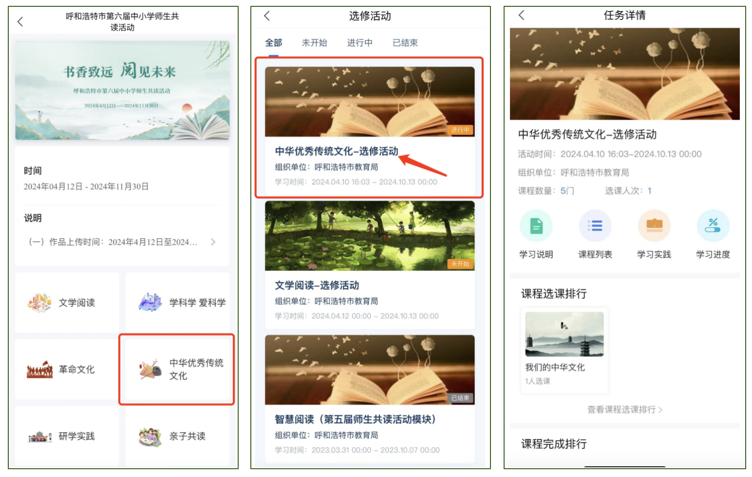 “文学阅读”及“中华优秀传统文化”中均有“选修活动”模块,参与方式相同。