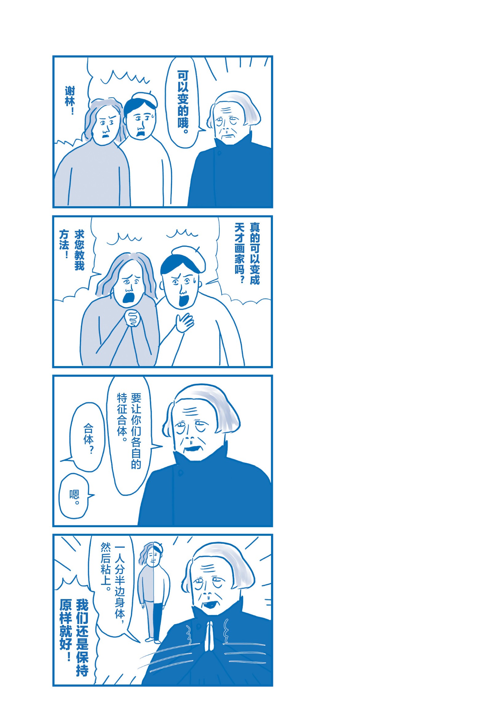 我猜很多读者可能会想,他到底在说什么?其实谢林的发言真的是有理论依据的。谢林主张一种主客观合一的“同一哲学”,但这在日常生活中是不可能的,比如,自我和世界成为一体。不过谢林主张,这种哲学在天才的艺术里是可以被实现的。当然,不是指把两人拼成一个……