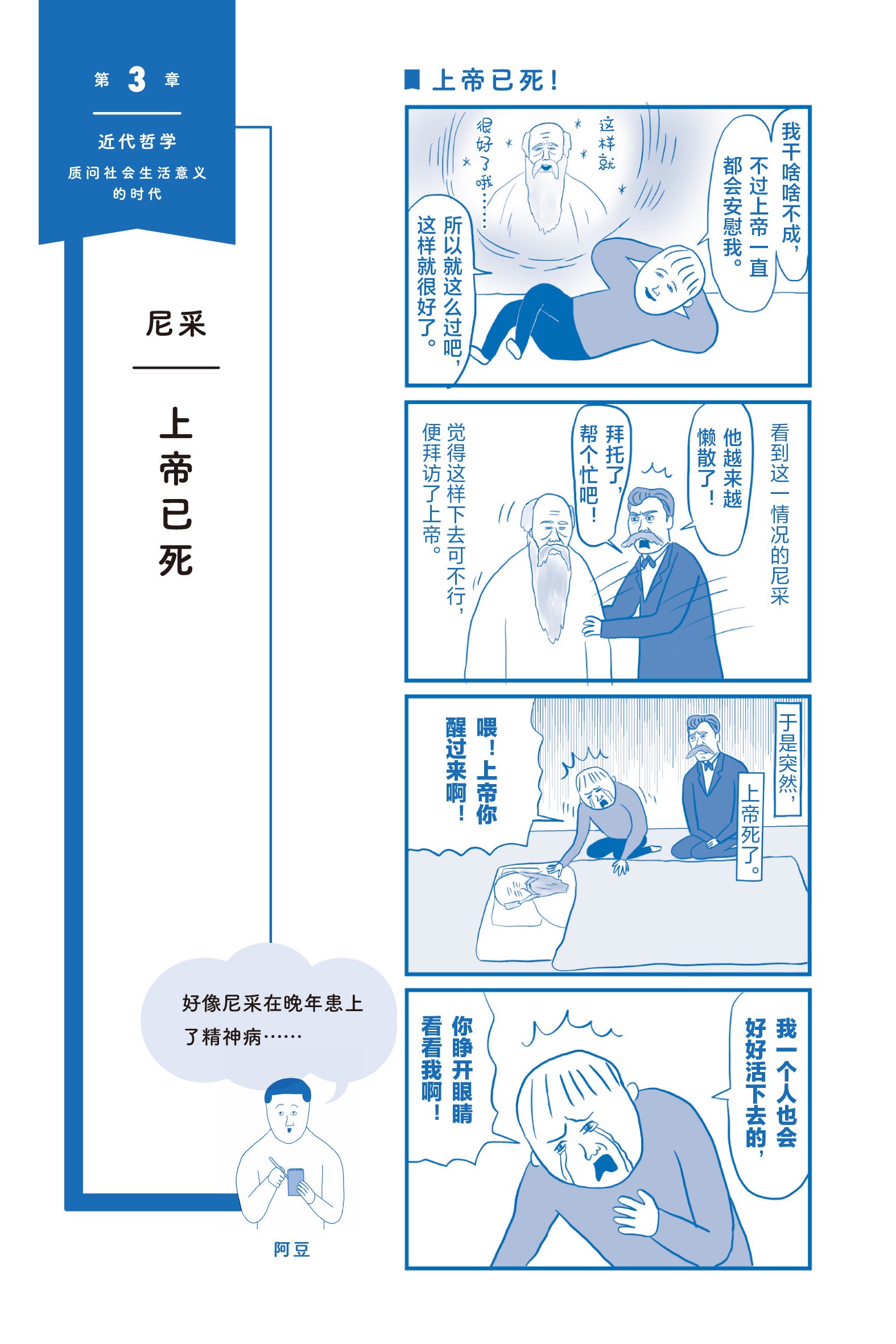 即便看不见上帝,但只要你相信他,你就能感到安心,因为上帝是一种会让人产生信赖感的巨大存在。不过,尼采说这样不行,他表示大家过于依赖上帝了。至少,在尼采生活的19世纪,西方社会就是这种状况。所以他才会说“上帝已死”,或许,尼采是想吐槽:“明明看都看不见,你们又是怎么知道上帝存在的?”