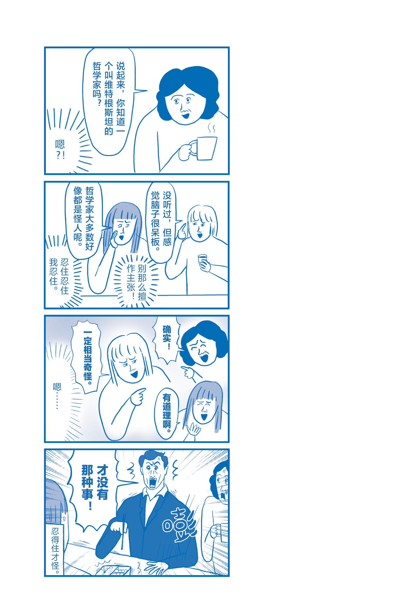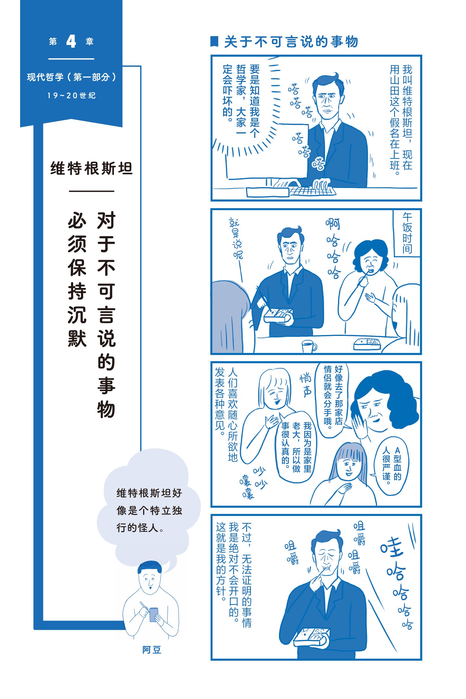 即便是在特立独行的哲学家里,维特根斯坦都是公认的与众不同。他有一句哲学名言“对于不可言说的事物必须保持沉默”,意思是无法被语言表达的东西,不能说是思考过的。所以在漫画里,他才会说“无法证明的事情我是绝对不会开口的”。不过,他自己似乎是个例外……