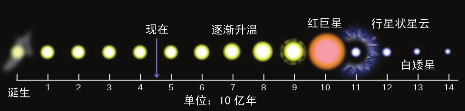 图1-7记录了一颗类太阳恒星的生命进程——图片左侧表示它的诞生,形成于气体尘埃盘的中心的,是一颗原恒星,后来变成了像太阳一样的恒星。在主序星阶段(能量来自氢聚变成氦)度过了大半生之后,恒星中心开始将氦聚变为碳,温度逐渐升高,体积不断膨胀,直到变成一颗红巨星,就像图右侧展示的那样。