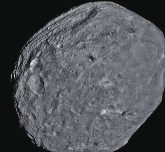 “曙光”号(图2-18)是NASA的空间探测器,目的是探索小行星带最大的两个天体:谷神星与灶神星(4 Vesta,主带型)。“曙光”号于2007年9月27日发射,2011年7月16日抵达灶神星(图2-19),环绕灶神星并展开探测任务。后于2012年9月5日飞离灶神星,2015年3月6日抵达谷神星。“曙光”号是第一个环绕主带小行星的探测器,也是第一个环绕过两个太阳系天体(不包含地球)的探测器。