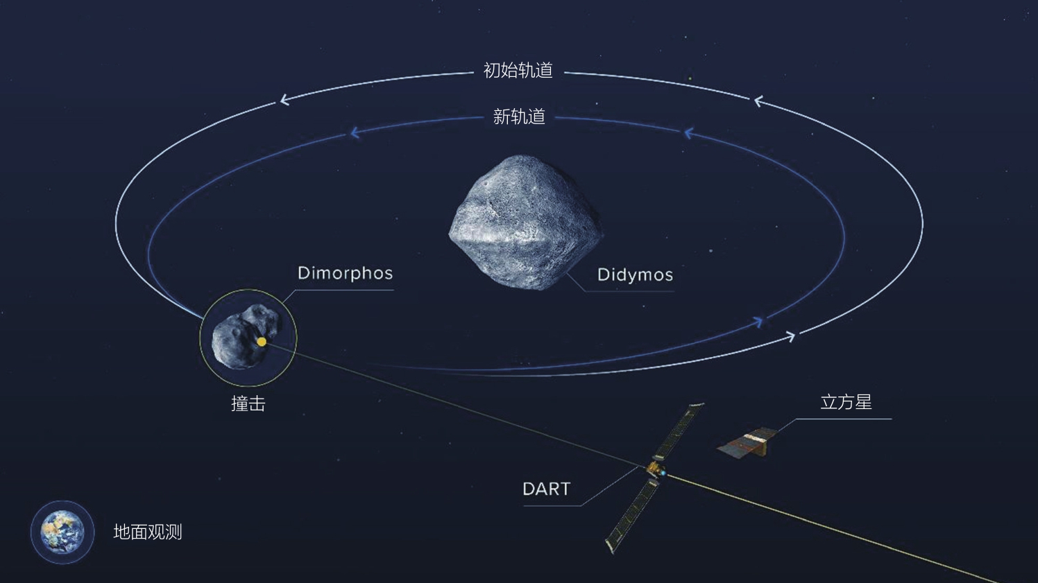 从地球上看,Didymos系统是一个食双星,这意味着Dimorphos在绕着更大的小行星运行时,会从Didymos的前面和后面经过。因此,地球上的望远镜可以测量Didymos组合系统亮度的规律性变化,以确定Dimorphos的轨道。DART 撞击时间选在2022年9月,此时地球和 Didymos 之间的距离最小,这样可以实现最高质量的望远镜观测,以确定DART撞击的影响。