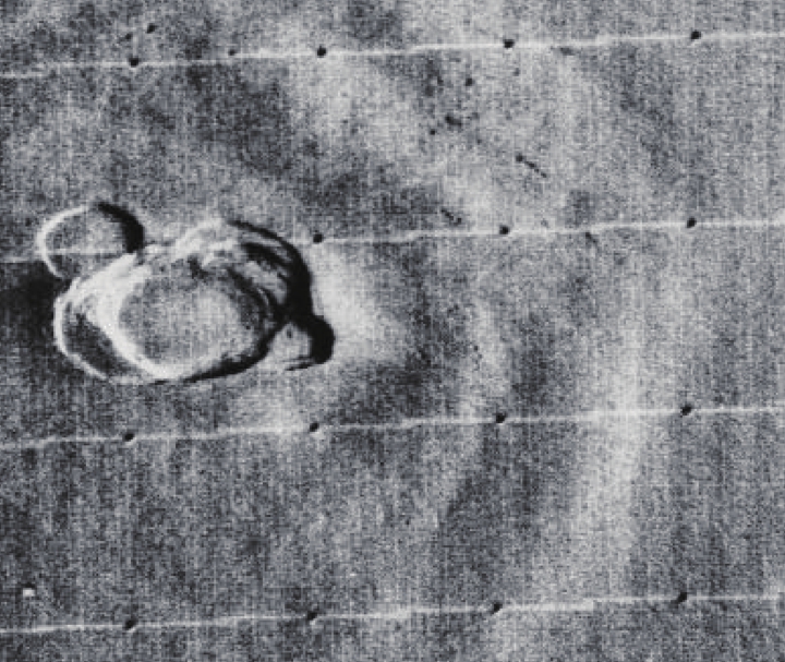 美国的“水手-9”号是第一颗火星人造卫星,它于1971年11月14日进入火星轨道。两周后,两颗苏联卫星——“火星-2”号、“火星-3”号也抵达火星轨道。不幸的是,此时整个火星发生了罕见的沙尘暴,整个火星都被沙尘暴笼罩,只能看见几座最高的山峰(图3-7)。1972年,随着火星上沙尘暴的停息,“水手-9”号上搭载的照相机显示了一个不同的世界。照相机拍摄了大量分辨率从100米至几千米不等的照片,展示了火星地貌的多样性。火星上有太阳系中最高的山峰和最大的峡谷,干涸的河床,多层的极冠结构,由于风化作用形成的不同岩石结构和大量的坑地。1973年,“火星-4”号、“火星-5”号、“火星-6”号和“火星-7”号探测器飞往火星,它们大多以失败告终,但是传回了几十张高分辨率图像,以及其他有关火星大气层、电离层和火星邻近星际空间环境的一些数据。