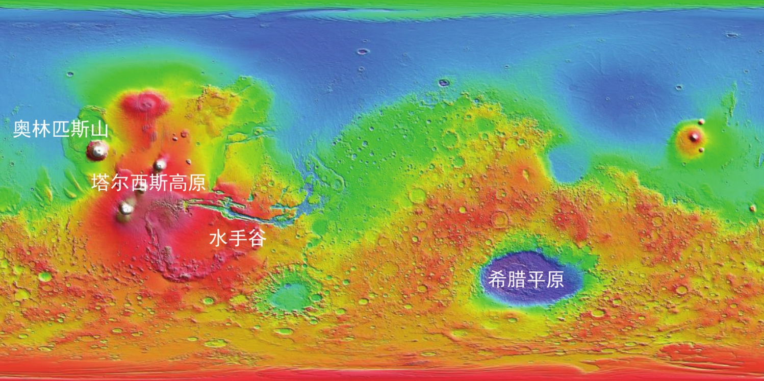 火星上的海拔最低处位于希腊平原(Hellas Planitia),这是太阳系中最大的清晰可见的撞击坑。从撞击坑边缘的最高点到坑底的最低点,垂直高差超过9千米,这个高差可以将珠穆朗玛峰完全放进去。撞击坑底部的大气压是高处的两倍,可以在有限的温度范围内维持液态水的存在。从奥林匹斯山的山顶到希腊平原底部的高度差有30多千米,而地球上从珠穆朗玛峰顶部到马里亚纳海沟的底部垂直高差只有20千米。