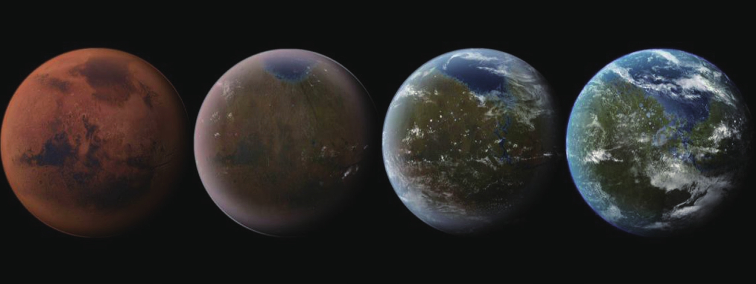 随着更多的探测器陆续在火星着陆,我们发现火星曾经是一颗适宜居住的行星(图3-19)——有液态水和稠密大气,也许火星可以再次成为一个宜居星球。火星地球化就是将火星改造成人类可居住的星球,也就是改造成类似地球的环境(图3-20)。这种想法最早是由美国天文学家卡尔·萨根(Carl Sagan)提出的。最近几十年来,学者和工程师一直在研究如何使火星变暖,将其大气改造得可以呼吸,就像在地球上一样自如生活。