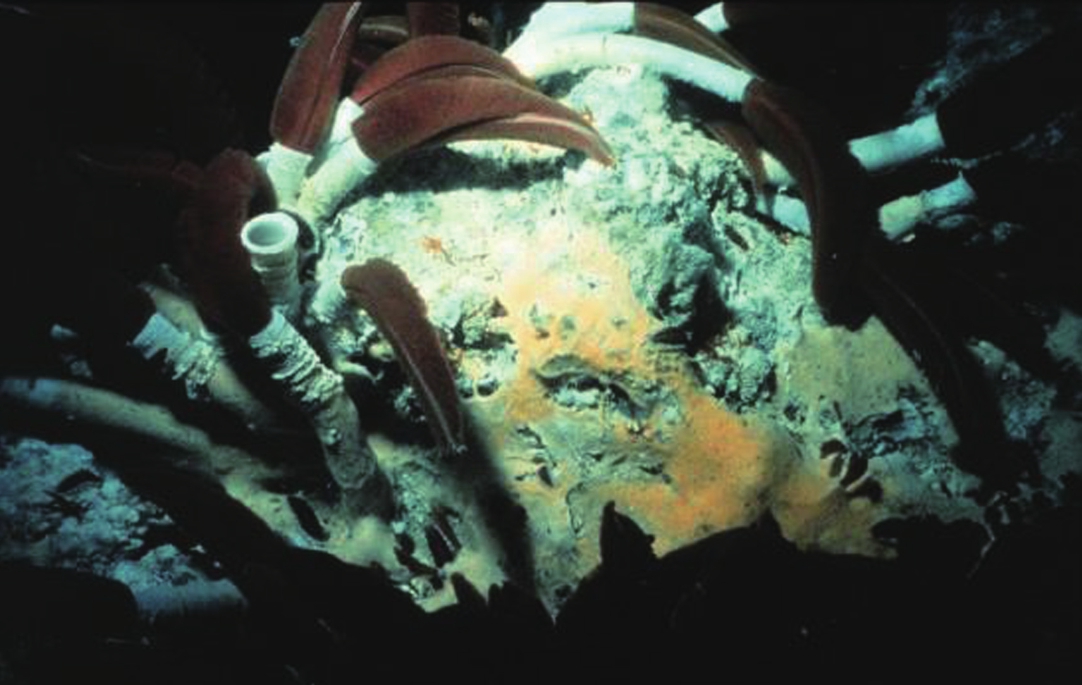 热液生态系统的初级生产者是嗜热细菌和古细菌,其能量来源于热液口喷出物质提供的化学能。它们通过氧化热液中硫化物(如H2S、FeS)和甲烷获得能量,还原CO2制造有机物,不依赖光合作用。很多种类的化学合成都会发生,因为不同种类的细菌可以通过氧化热液中的不同物质获取能量。这类细菌构成了食物链的基础,包括深海蛤蜊、贻贝和巨型管虫等物种与化学合成细菌共生(图4-14)。海底黑烟囱是研究深部生物圈的窗口,研究热液喷口周围的微生物,对于理解生命起源有重要意义。