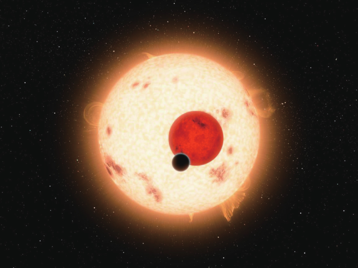 开普勒-16b(Kepler-16b)发现于2011年,这是天文学家发现的第一颗围绕两颗恒星公转的系外行星,也就是所谓的环双星行星,是现实生活中的“塔图因(Tatooine)”。塔图因,是《星球大战》中天行者家族的故乡行星。它被设定为一颗巨大的沙漠星球,围绕着一个双星系统运动。不同的是,开普勒-16b大约和土星一样大,而且是气态的,表面应该很冷。