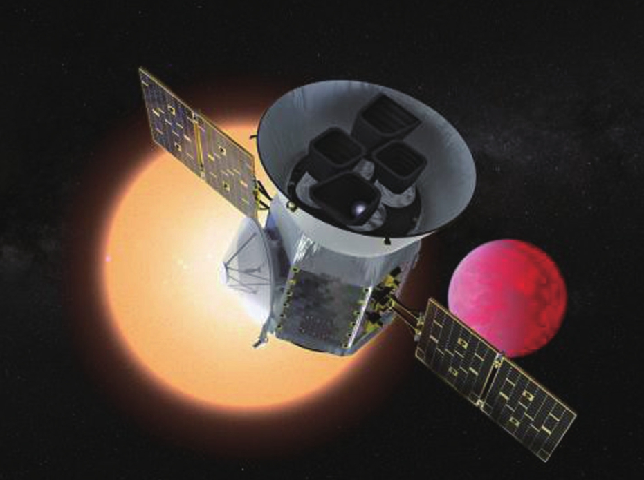 TESS,全称是凌星系外行星巡天卫星(transiting exoplanet survey satellite)(图5-19),它会接过开普勒望远镜的接力棒,使用凌星法观测太阳附近20万颗最亮的恒星。开普勒望远镜持续深入地观察了一小片天空,而TESS是一个几乎覆盖整个天空的巡天观测任务。TESS的设计目的是调查85%以上的天空,比开普勒望远镜覆盖的天空面积大400倍,以搜索附近恒星(大约200光年内)周围的行星。TESS观测的恒星通常比开普勒观测到的恒星亮30~100倍。因此,在这些恒星周围探测到的行星更容易通过后续观测来进一步研究,从而对行星的质量、大小、密度和大气特性进行精确测量,进而发现那些最有希望存在生命的系外行星。