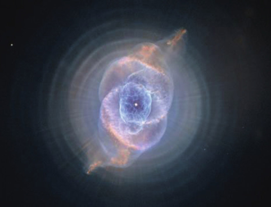 一些巨星会变得不稳定并开始脉动,周期性地膨胀收缩,并抛射出一些外层气体。最终,它所有的外层都被吹走,形成一个不断膨胀的尘埃气体云,称为行星状星云。图6-3展示的猫眼星云就是一个行星状星云。恒星几乎所有的外层大气都被抛出去之后,只剩下核心,科学家称这种恒星残骸为白矮星。白矮星大小与地球相仿,但质量是地球的数十万倍,一勺物质比一辆小汽车还重。白矮星内部不再产生能量,所以它会在数十亿年的时间里逐渐冷却,越来越暗,直至被遗忘。大约50亿年后太阳会变成一颗红巨星,外层大气都被吹走后,最终会变成一颗白矮星。