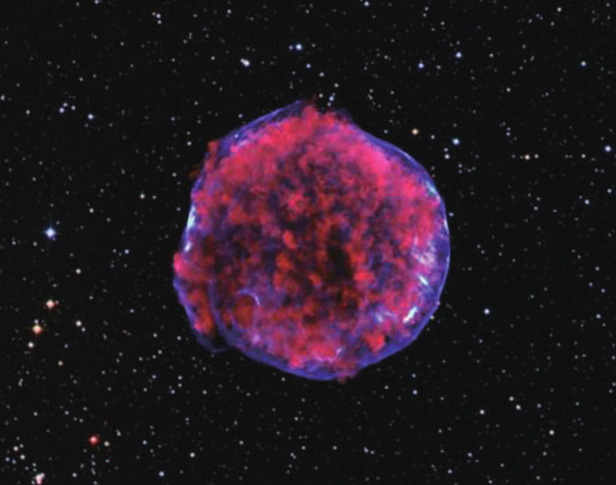 公元1572年,位于仙后座的一颗超新星爆发,丹麦天文学家第谷对这颗星做了观测记录,因此又被称为第谷超新星。这颗超新星距地球7500光年,它最亮时接近金星的亮度。钱德拉望远镜拍摄到了这颗超新星的遗迹,见图6-8。