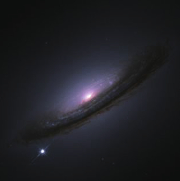 由于发生坍缩的临界质量(即钱德拉塞卡极限)是一定的,故可以认为,所有Ia型超新星爆发时释放的能量是相同的,也就是光度相同,意味着Ia型超新星可以作为理想的标准烛光。正是利用Ia型超新星的这一特性,天文学家才发现了宇宙正在加速膨胀,并由此引发了对宇宙暗能量的研究。因此,Ia型超新星对于宇宙学和物理学都具有重要的意义。图6-14显示的是一个螺旋星系NGC 4526,距离我们约5 000万光年。图中左下角的明亮光点,就是一颗Ia型超新星(SN 1994D),其亮度超过整个星系。