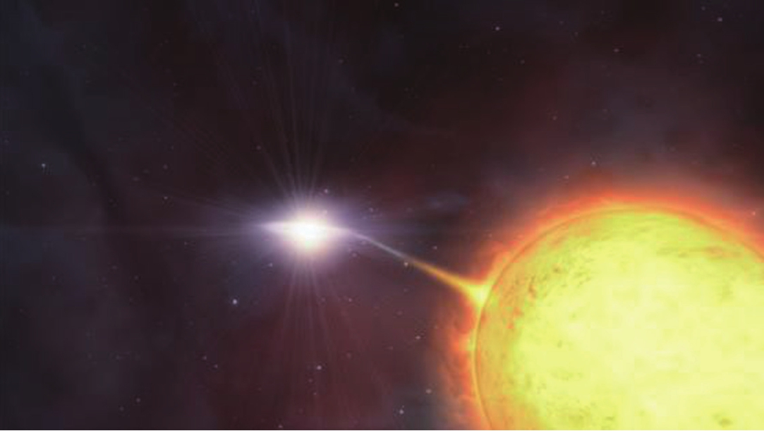 Ⅰa型超新星出现在各类星系中,特别是在椭圆星系里比较多。在旋涡星系中,它们并不出现在旋臂上,而是出现在旋臂之间或者星系晕中。椭圆星系、旋涡星系的旋臂之间和星系晕中都不会有年轻恒星存在,因而推测Ia型超新星爆发前应当是小质量的年老恒星。另一方面,Ia型超新星的光谱中缺乏氢,这曾使天文学家感到困惑,因为很难理解它们在爆发前是如何失去氢壳层的。把这两方面综合起来考虑,现在的普遍看法是,Ia型超新星爆发前是密近双星中的一颗子星,质量大约为太阳质量的3到8倍,演化到末期形成碳-氧中心核,最后成为一颗碳-氧白矮星。它周围的气壳由于伴星的引力吸积而被完全剥离掉,这就同时解释了老年星和氢缺失的问题。伴星后来演化成红巨星,体积膨胀使得白矮星反过来吸积伴星的物质(图6-13),当质量超过钱德拉塞卡极限(太阳质量的1.44倍)时,它就会坍缩并触发碳燃烧,同时伴随超声速运动——爆轰波(激波)。爆轰波传到未燃烧的部分时,压缩并加热物质,激波扫过的地方迅速升温到点火温度,立即触发核燃烧。整个反应看上去像是失控的核爆炸。在爆炸中同时进行极其迅速的连锁核反应,产生包括铁在内的一系列重元素。
