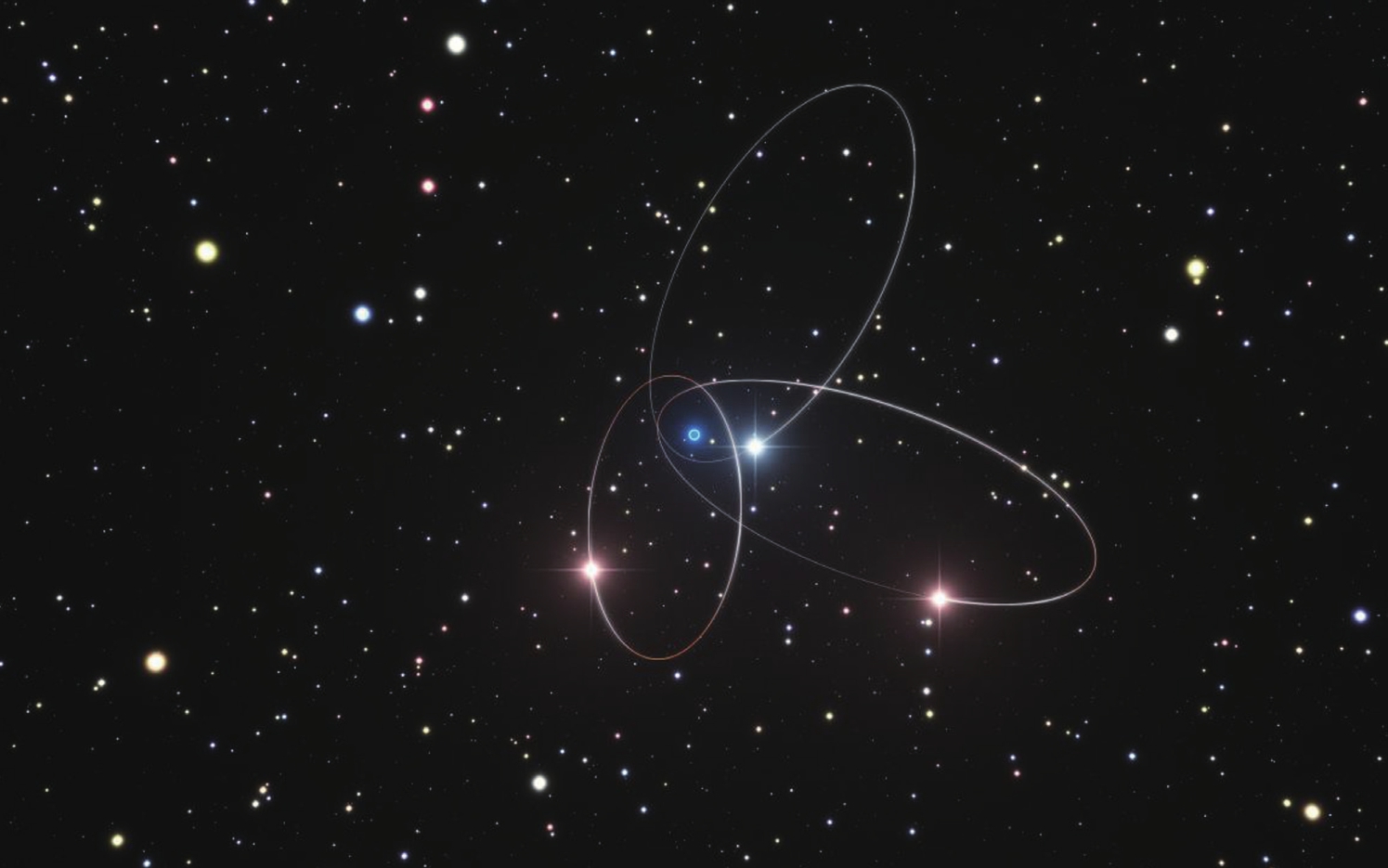 黑洞既不发光也不反射光,因此望远镜无法直接看见它们。科学家们主要根据它们对周围环境的影响来发现和研究它们。超大质量黑洞的强大引力会导致恒星以特定的方式围绕它们运行(图7-3)。天文学家追踪了银河系中心附近几颗恒星的轨道,发现了一个超大质量黑洞,这一成果获得了2020年诺贝尔物理学奖。黑洞可以被称为吸积盘的气体尘埃环包围,这些吸积盘可以发出各种波长的光,但能量主要集中在X射线波段。天文学家可以用X射线望远镜发现这种X射线源,并确定这些射线源是不是黑洞。另外,黑洞可以弯曲来自更远物体的光,这种现象被称为引力透镜效应,可以用来寻找孤立的黑洞。孤立的黑洞是指黑洞周围没有恒星或其他物质,这种黑洞是隐藏的,无法通过引力作用或者吸积盘的X射线来探测到它们。最后,当大质量物体在空间中加速时,它们会在时空结构中产生涟漪(即引力波),科学家可以通过引力波探测器发现黑洞。