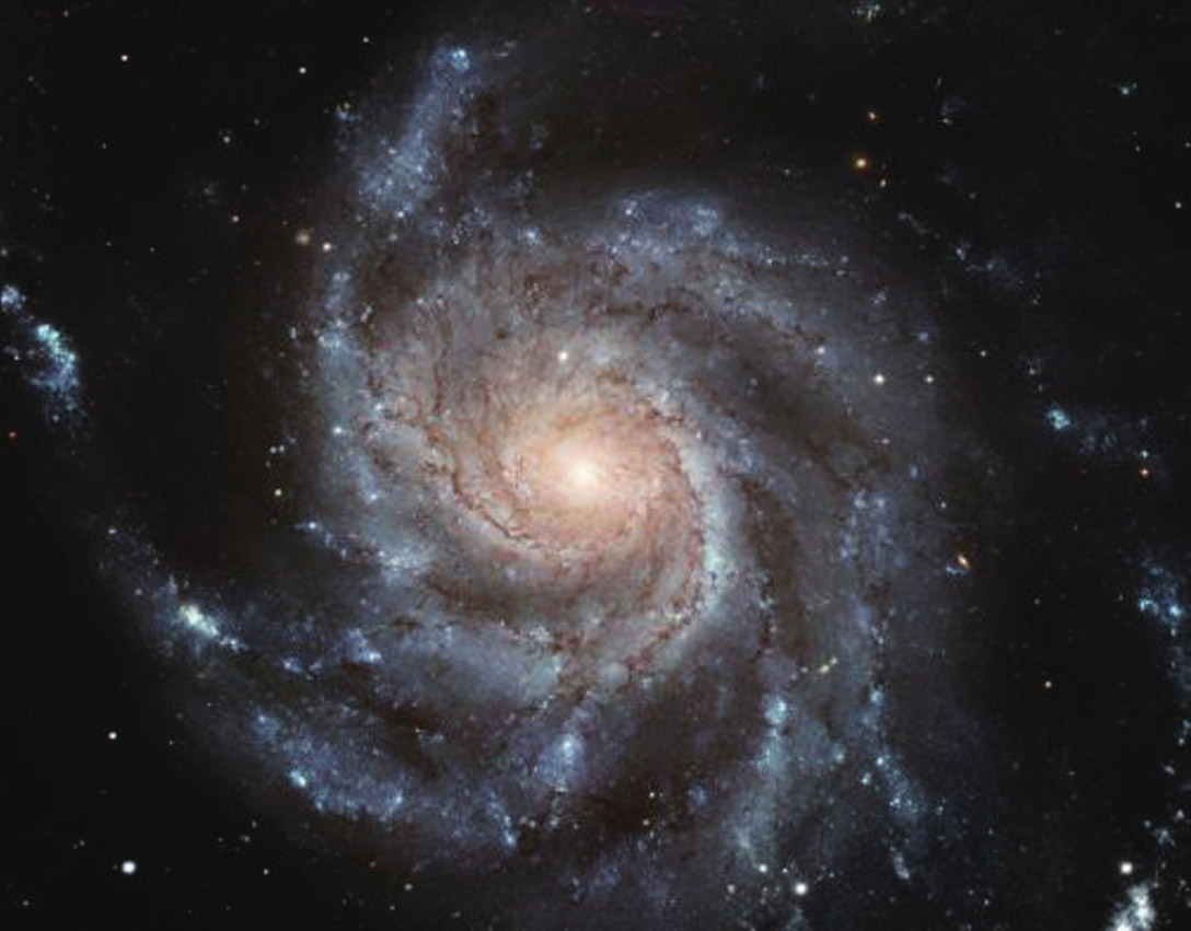 旋涡星系具有螺旋结构,这些星系看上去就像巨大的旋转风车(图8-8),是复杂性、秩序和美的极致。旋涡星系中心一般为球状或椭球状的核球,是恒星密集的区域。核球外面是一个薄薄的圆盘,称为星系盘,有两条或多条旋臂从核球外缘向外延伸出去。旋涡星系用字母S表示,依据旋臂的伸展程度和核球的相对大小,还可以分为Sa、Sb、Sc等亚型。Sa型的核球最大,旋臂缠得最紧,Sc型的核球最小,旋臂最松弛,Sb型介于中间。旋涡星系中有比较多的气体和尘埃,主要集中在旋臂中,那里会诞生新的恒星,而年老的恒星主要分布在核球及星系晕中。