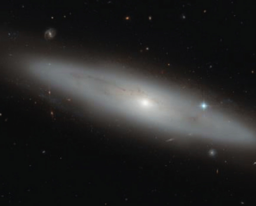 透镜星系(图8-10)是一种介于旋涡星系和椭圆星系之间的星系,用符号SO或SBO表示。它们有旋涡星系常见的中央凸起核球以及星系盘,但没有旋臂。和椭圆星系一样,透镜星系有更古老的恒星群,很少有恒星形成。关于透镜星系的演化,科学家有不同的理论。有一种观点认为,这些星系是较老的旋涡星系,它们的旋臂已经消失。另一种观点认为透镜星系是由旋涡星系合并形成的。