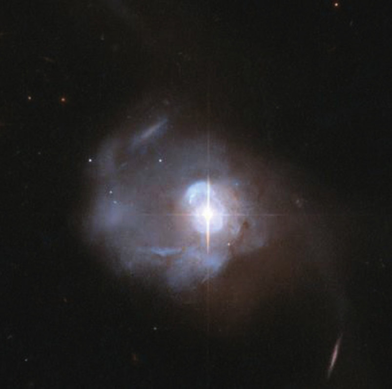 类星体的名字来源于“类恒星射电源”这个术语,它们是非常遥远的点状源。类星体这个名称容易误导人,实际上它们是超大质量黑洞驱动的活动星系核。类星体是活动星系中最明亮的一种。类星体发出的辐射覆盖整个电磁波谱,从无线电到可见光,到γ射线,它们产生强大的粒子喷流,辐射出极高的能量。最近的类星体叫作马卡里安231(Markarian 231)(图8-12),距离我们大约6亿光年。越是往宇宙深处看,类星体就越多,科学家已经确定了超过100万个类星体,目前已知的最远的类星体距离地球大约130亿光年。由于光的传播需要时间,科学家可以通过这些类星体发出的光回溯过去,研究黑洞的生长和星系的演化。在年轻的宇宙中,星系合并可能会为类星体的巨大能量输出提供燃料,但是当黑洞疯狂吞噬结束时,类星体就无法维持它的能量输出了。所以类星体的活动应该是断断续续的,整个阶段可能持续大约1000万年。