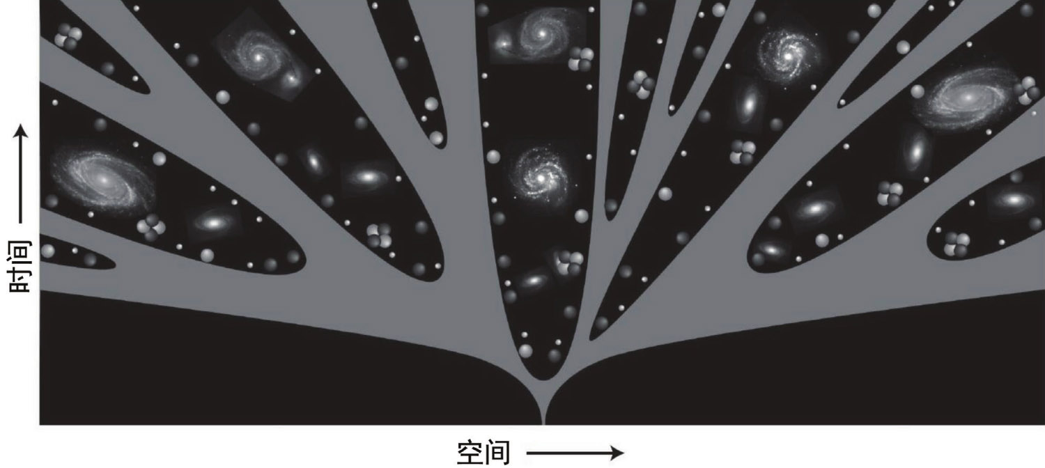 有些区域会停止暴胀,就像我们的宇宙一样,而有些区域会发生永恒暴胀,飞快地制造无限的空间,这样便会孕育出互相隔绝的时空区域,变成一个树状的结构(图9-11)。树枝间的U形区域就是暴胀结束的产物,而每个这样的U形区域里都是无限多个第一层平行宇宙。这棵树还会一直生长下去,就像不断发新枝一样,创造出无数多个这样的U形区域。我们与第二层平行宇宙隔着永恒暴胀的空间,所以我们永远也无法穿过树的枝丫,到达那些有着不同物理定律的平行宇宙。