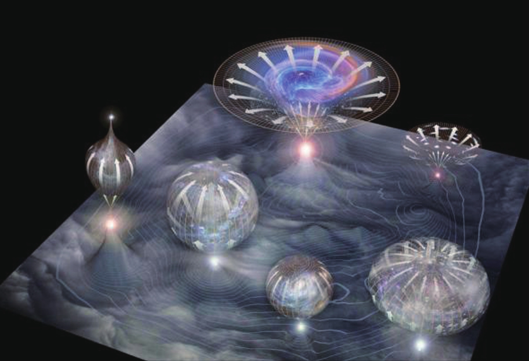 我们的宇宙似乎经历了某种精细的微调,一切都刚刚好允许生命的出现,但是只要其中一项有细微差别,可能生命根本不会出现。有没有一种可能,存在不同的空间、不同的宇宙,其中的物理定律、基本参数和我们的世界不一样。物理学家提出了一个“M理论”,被认为最有可能成为宇宙图景的统一理论。有些物理学家相信,暴胀随时都在发生,而且每次暴胀出来的宇宙各不相同,如图9-10所示。而M理论能开启的宇宙有10500种!其中的物理定律和空间状态各不相同,绝大多数根本不适合住人。这些不同的宇宙就是第二层平行宇宙。