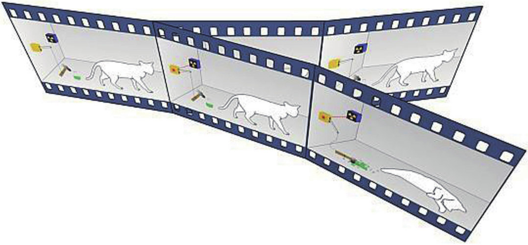 前两层平行宇宙是宏观上的,都和永恒暴胀有关,而第三层平行宇宙会把我们拉回微观的尺度。第三层平行宇宙被称作“量子平行宇宙”。量子力学里有一个思想实验——薛定谔的猫。把猫关在一个盒子里,盒子里放置一罐剧毒的氰化物,罐子的开关和一个放射性原子相连,如果这个放射性原子发生衰变,罐子就会打开,释放氰化物,杀死猫。但由于原子的衰变是一个随机事件,所以我们不知道猫到底是死是活。经典的“哥本哈根解释”认为,只有在我们打开盒子,亲自观察那只猫时,猫才会处于生或者死这两种状态中的一种,但在打开盒子之前,猫一直都处于生和死的叠加态中。