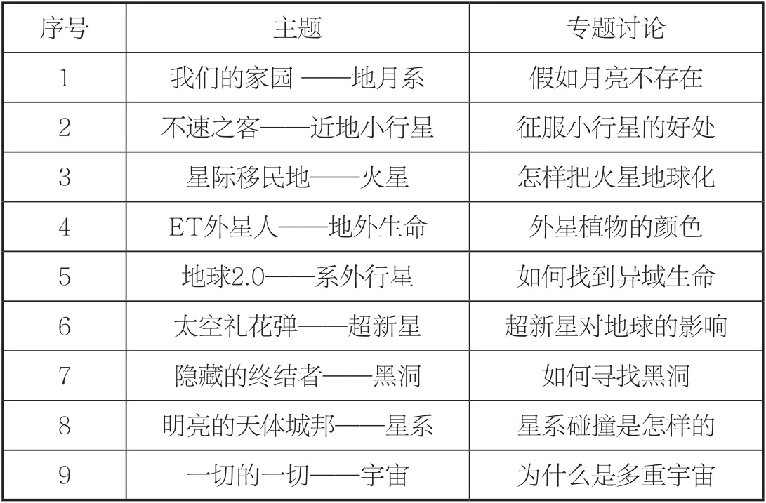 “天文学热点问题概论”在高一第二学期开设,主要讲述有关天文学前沿热点问题的知识、方法以及最新进展。课程分为九大主题:地月系、近地小行星、火星、地外生命、系外行星、超新星、黑洞、星系、宇宙,每个主题都有相应的专题讨论(附表1)。课程内容上尽可能吸纳主流科学媒体的科技报道,在课程中渗透该领域的最新发现、最新成果,让学生能够体验到科技进展的日新月异。