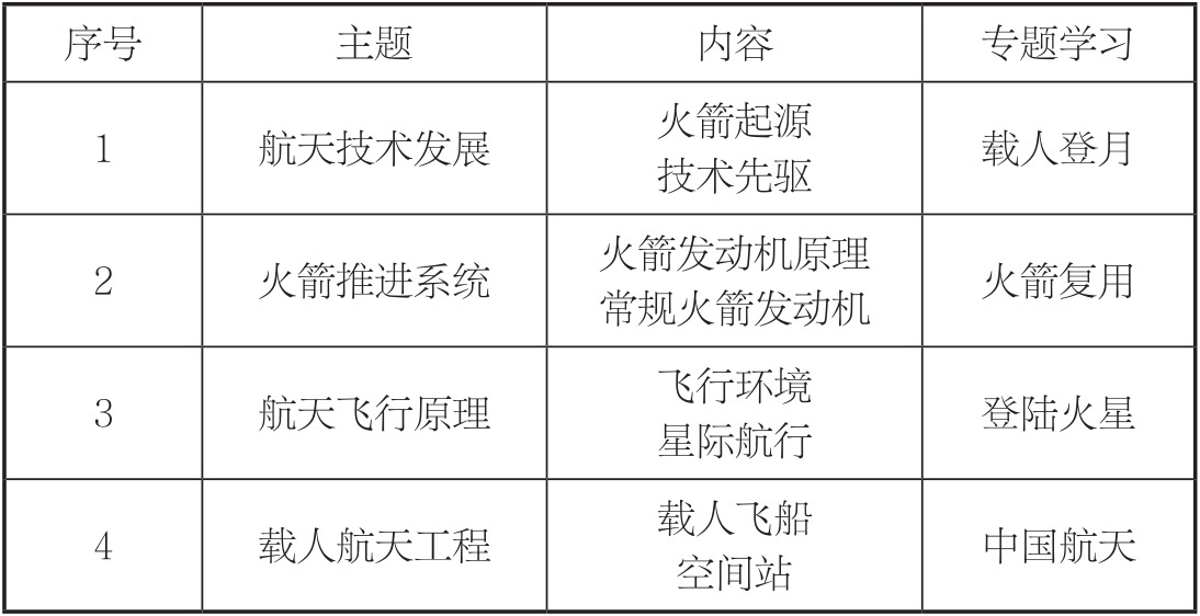 “航天技术引论”在高二第一学期开设,是在天文学热点问题探讨的基础上,展现天文学发展和航天技术进步的密切关联,结合我国航天科技的迅猛发展,讲述航天技术的基本原理、发展概况以及应用前景等。课程由四大主题构成:航天技术发展、火箭推进系统、航天飞行原理、载人航天工程,每个主题由两节内容构成(附表2)。
