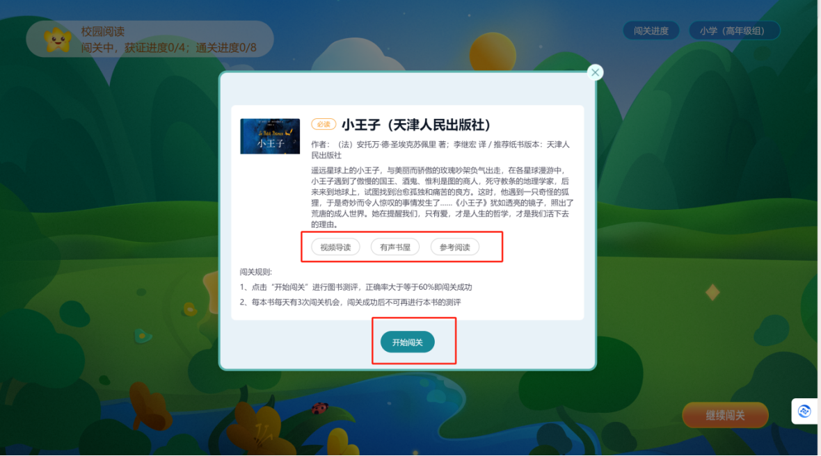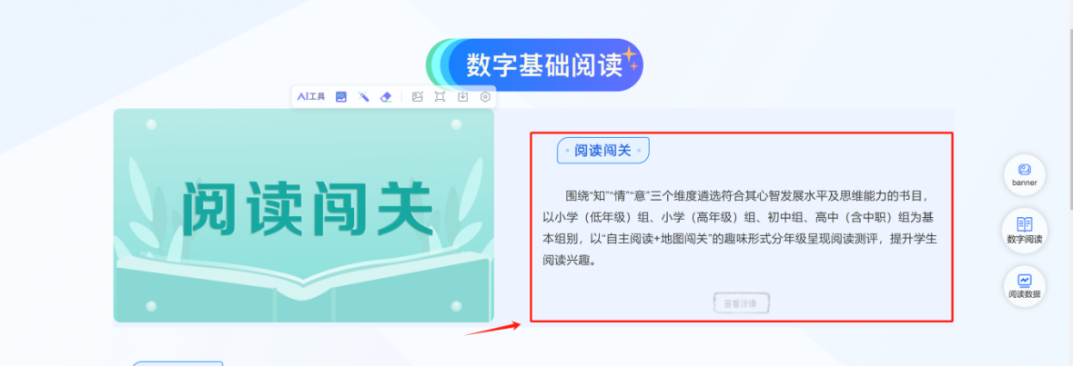 (1)进入阅读专题界面后,点击“阅读闯关-查看详情”,进入阅读闯关界面。