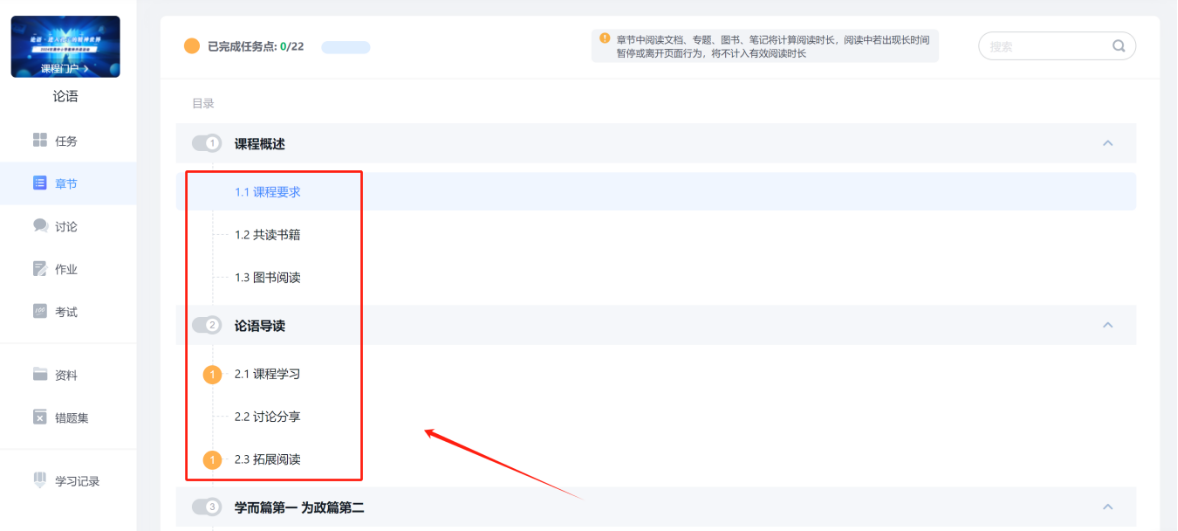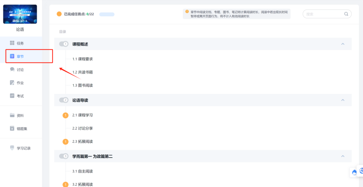 (4)进入课程后,点击“章节”,打开课程章节目录;