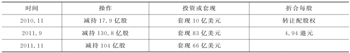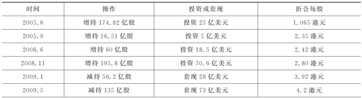 但仅仅两个多月之后,2011年11月11日和14日,美国银行即以协议转让方式向几家机构投资者转让约104亿股建行H股股份,套现66亿美元(约合人民币419.66亿元),占建行总股本的4.14%,交割在2011年第四季度完成。以其时当时的收盘价计算,美国银行由此获得575亿港元。此次转让后,美国银行持有建行H股股份21亿股,仅占建行总股本的0.84%,占建行H股的0.87%。而此时,距美国银行做出继续保持战略投资者身份(持股比例不低于5%)的承诺尚不足3个月。表9-4为2005年至2011年美国银行增减持建行一览表。