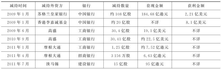 据《证券日报》统计,自2009年1月7日,香港李嘉诚基金会率先抛售20亿股中行H股,获利8.1亿美元(见表9-5),苏格兰皇家银行紧随其后,悉数出售其所持的4.26%中行股权,套现约185亿港元,获利2.21亿美元,直至2011年11月的3年间,外资机构共减持套现中资银行股2230亿港元,仅美银一家就套现1433亿港元,高盛、淡马锡分别套现260亿港元、280亿港元。