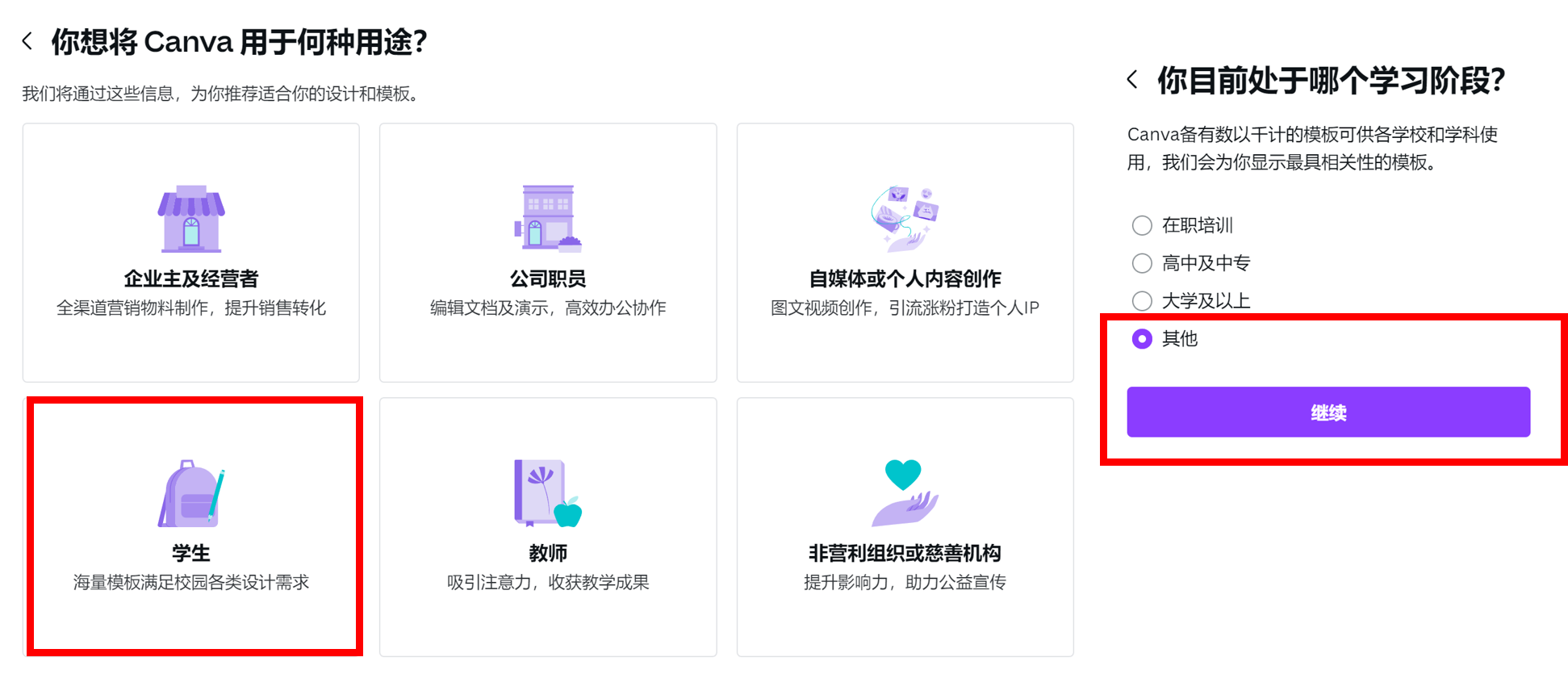 选择身份为“学生”,阶段为“其他”,点击“继续”。