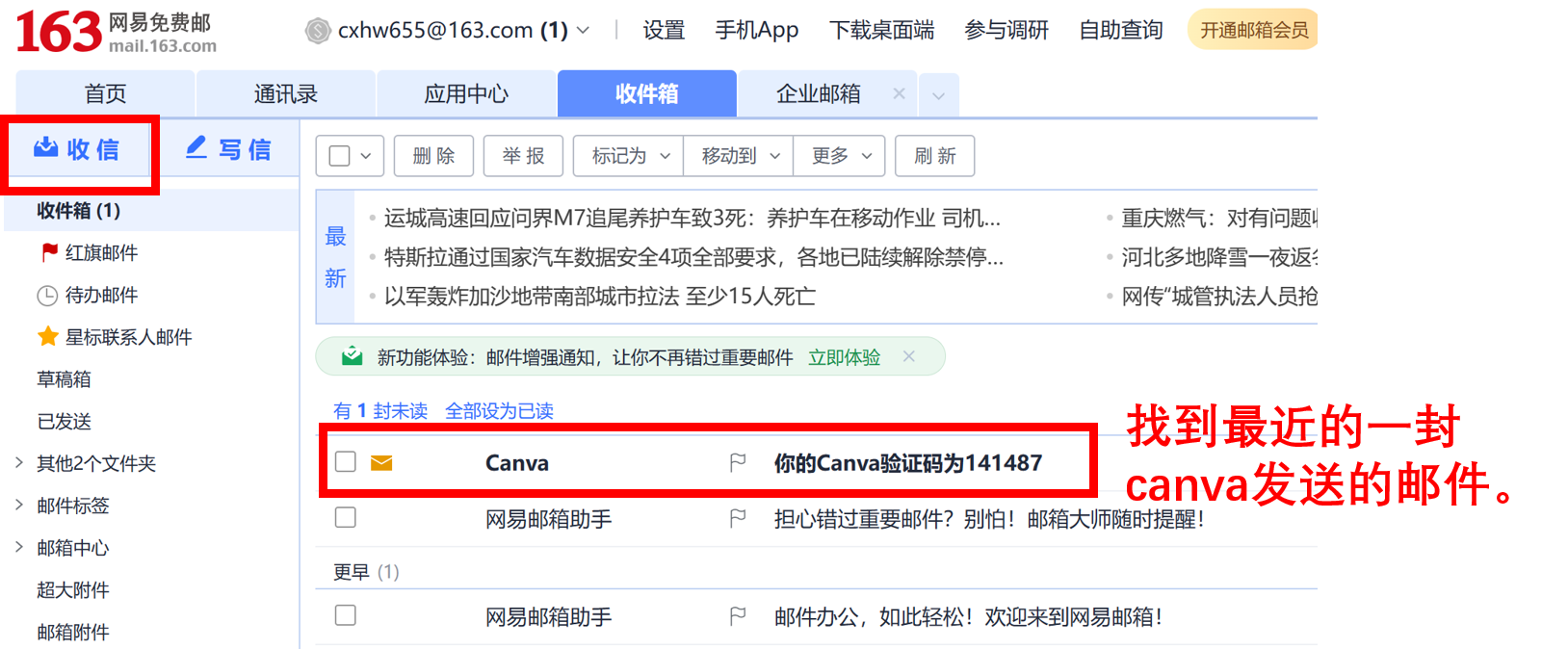 注意:若提示未收到新邮件,则再次点击“收件箱”。