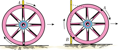 图1-6 要证明车轮上半部比下半部移动得更快,只要比较车轮上A、B两点到固定木棒之间的距离就行了