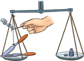 把一只夹碎胡桃用的铁钳放到天平的一只盘上,这只钳的一只“脚”平放在盘面上,另一只脚用细线挂在天平的挂钩上。天平的另一只盘上放砝码,使两边恰好达到平衡。现在,用一根燃着的火柴把细线烧断,于是,原来挂在钩上的那只脚就落到盘上来。请想想看,当这只脚落下的一瞬间,天平会起一些什么变动?在这只脚还在继续落下的这一瞬间,放着钳子的这只天平盘会向下沉,还是向上升,抑或停留在原地不动(图2-12)。