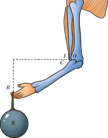图2-15 人体的前臂骨(C)属于不省力的第二类杠杆。杠杆的支点关节处,即O点;二头肌发出的作用力,其作用点在I点;其要克服的阻力,也就是重力的作用点在B点。BO的臂长大约是IO臂长的8倍