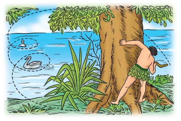 图3-8 隐藏在大树后的原始人使用飞旋标来猎取食物。图中的虚线表示飞旋标的飞行轨迹(注意是没有命中目标时的)