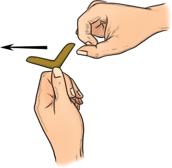 为了便于在室内练习,我们可以用纸做一只飞旋标。按照图3-9所示的形状,裁剪卡片纸,每边长度为5厘米左右,宽度要窄于1厘米。用拇指和食指捏着这只纸标,如图3-9所示,用另一只手的食指稍稍向上方快速弹向它。它就会立刻从手中飞出,飞5米远左右,划出一道优美的弧线,如果幸运,没碰到室内的任何东西的话,它又会折向你,落回到你的身边。