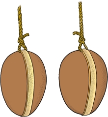 做此类的实验,也可以选用其他的方法,比如用橡皮圈。我们用橡皮圈把生蛋和熟蛋沿各自的“子午线”箍紧,然后用相同的细线以相同的长度分别将它们吊悬着(图4-2),将这两条细线同向扭转相同的次数以后,同时松开,你很快也能看到生蛋与熟蛋的区别:熟蛋在转完扭圈数后,会继续扭转,随后又反转退回来,如此反复几次,每次的转数逐渐减低,最后才完全停下来。而与此同时,生蛋早停了下来,它只来回扭转三四次:原因也是生蛋的蛋白、蛋黄像“刹车器”一样阻止它的旋转。