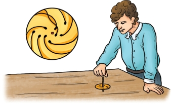 我们现在可以利用这个陀螺做一个十分有趣的实验:在旋转陀螺之前,先滴几小滴墨水在纸片上。在墨水还没干燥前,立刻旋转它。当陀螺停下来后,我们再看那些墨水滴:每一滴墨水竟然划了一条螺旋线,将这些螺旋线合起来看的话,它们的模样就像一股旋风。